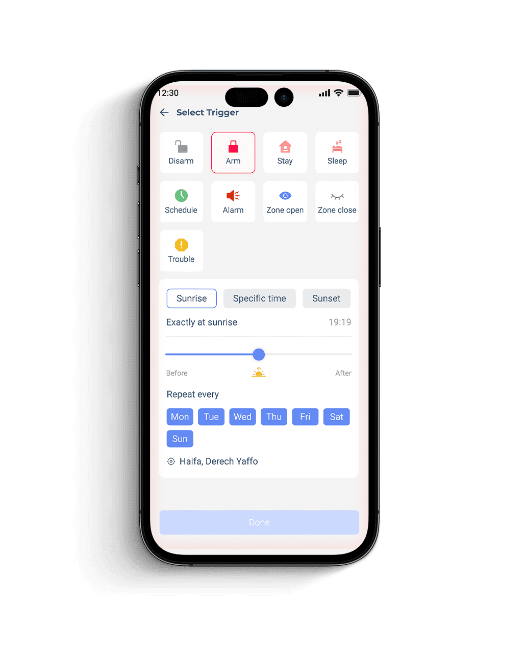 This UX flow enables users to create smart automation scenarios by linking triggers (e.g. arm, sunrise) with device actions. It uses clear iconography, modular structure, and intuitive time settings. The layout mimics controller logic, making complex setups simple and scalable for security and smart home environments.