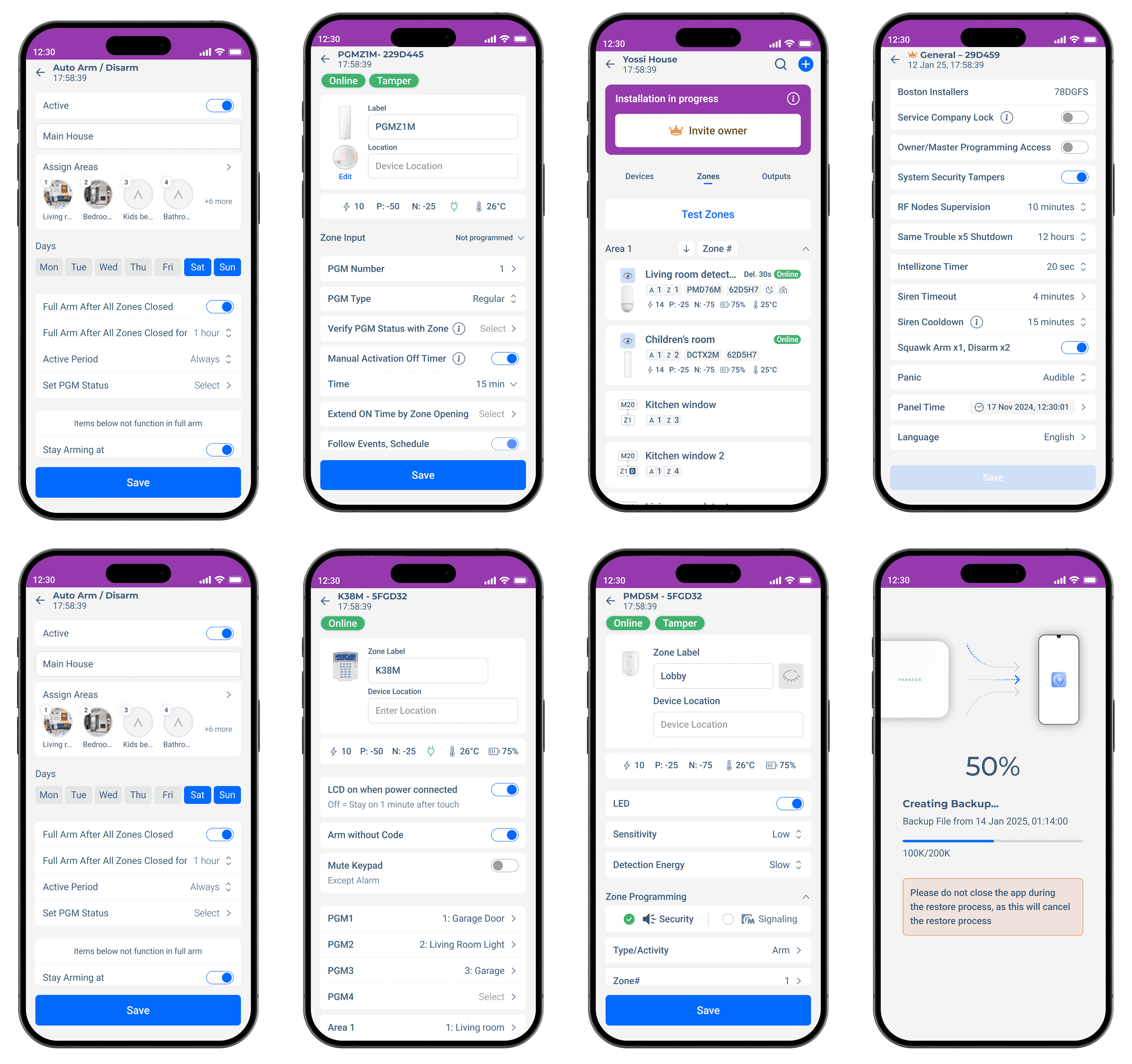 This screen streamlines device programming by combining status indicators, real-time metrics, and editable details in a clear layout. Settings are grouped logically, with dropdowns, toggles, and inline explanations for ease of use. Installers can quickly adjust default states, types, timers, and zone links, ensuring efficient configuration while maintaining clarity and reducing cognitive load during setup.